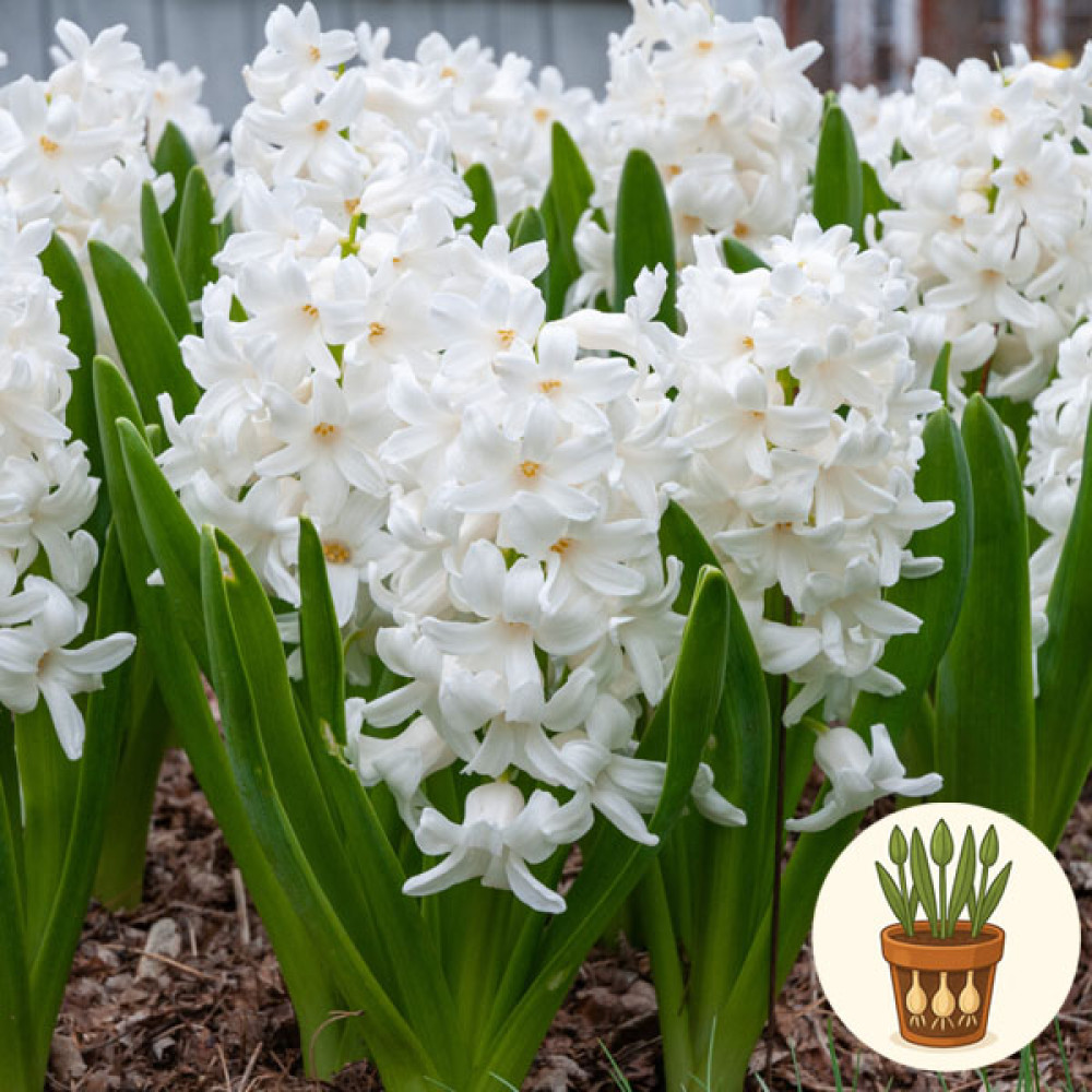 У горщику висаджена одна цибулина гіацинта сорту Aiolos. Це елегантний білий гіацинт із щільними, рівними суцвіттями чисто-білого кольору та приємним, виразним ароматом. Класичний вигляд і світла палітра роблять гіацинт Aiolos універсальним варіантом для будь-якого інтер’єру.