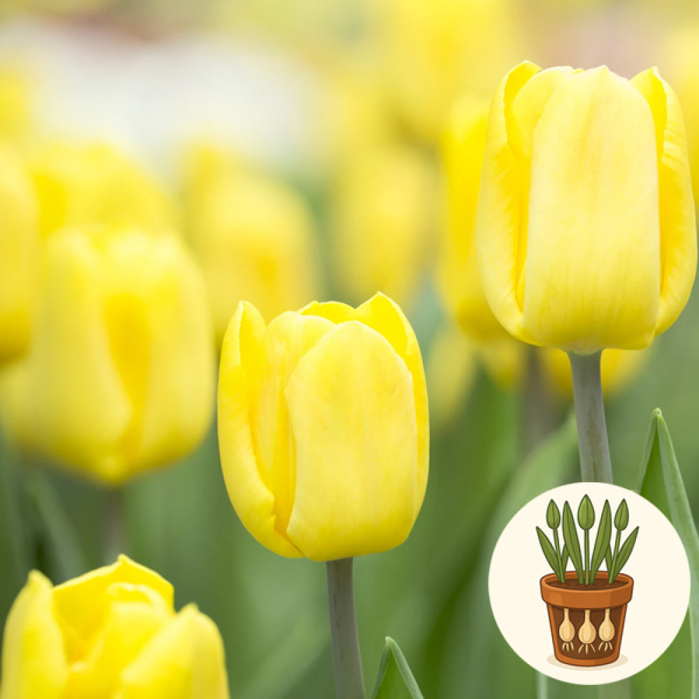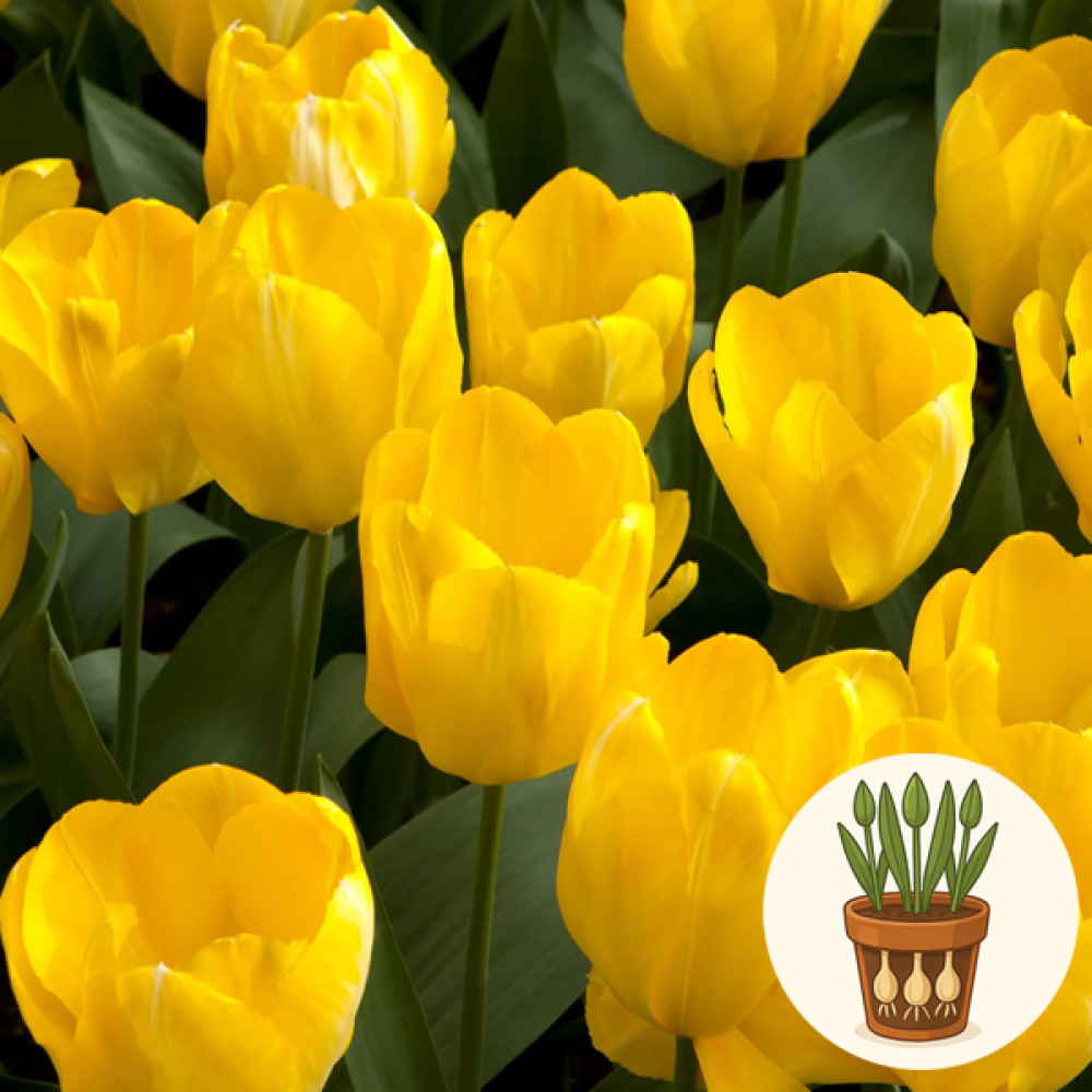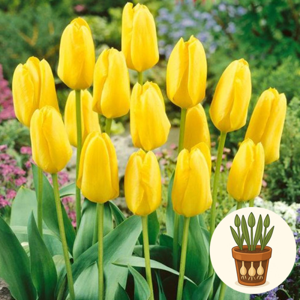 У горщику висаджено три цибулини тюльпана сорту Candela. Це яскравий ранній сорт із стрункими келихоподібними квітами чистого жовтого кольору, що нагадують маленькі свічки на міцних стеблах. Сонячне забарвлення тюльпанів Candela миттєво додає світла й тепла будь-якому підвіконню чи весняній клумбі.