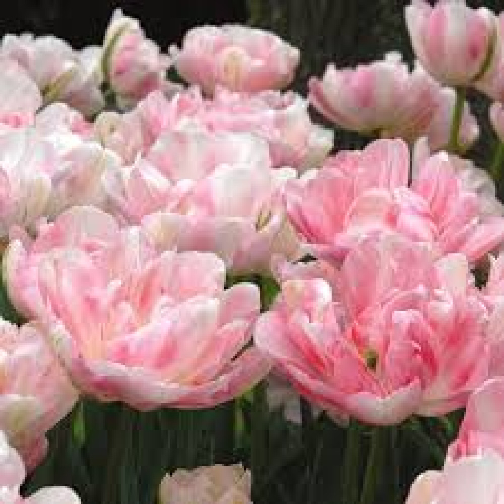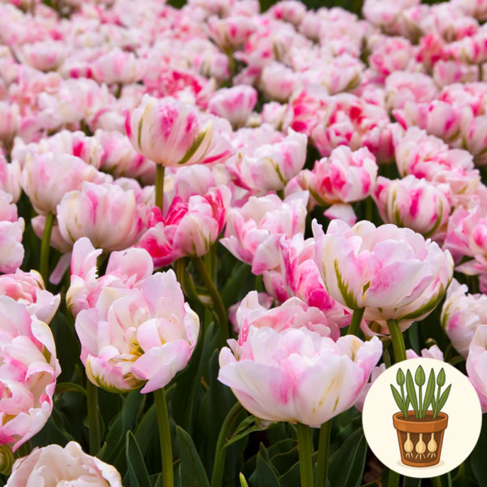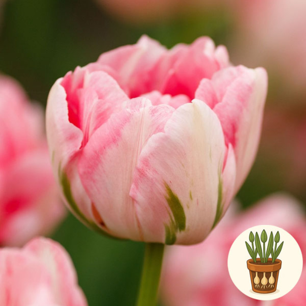 У горщику висаджено три цибулини тюльпана сорту Finola. Це один із найвідоміших махрових пізніх сортів із великими півонієподібними квітами ніжно-рожевого кольору з кремово-білими висвітленнями по краях пелюсток. Ніжна пастельна гама робить тюльпани Finola особливо романтичними й елегантними.