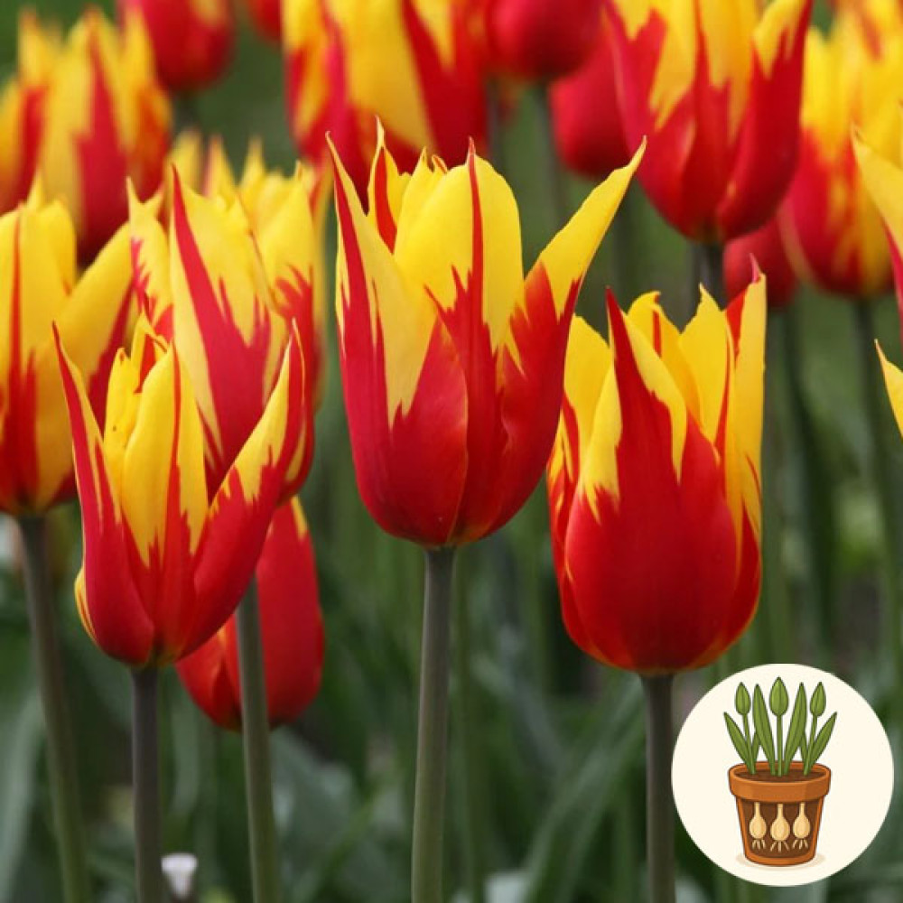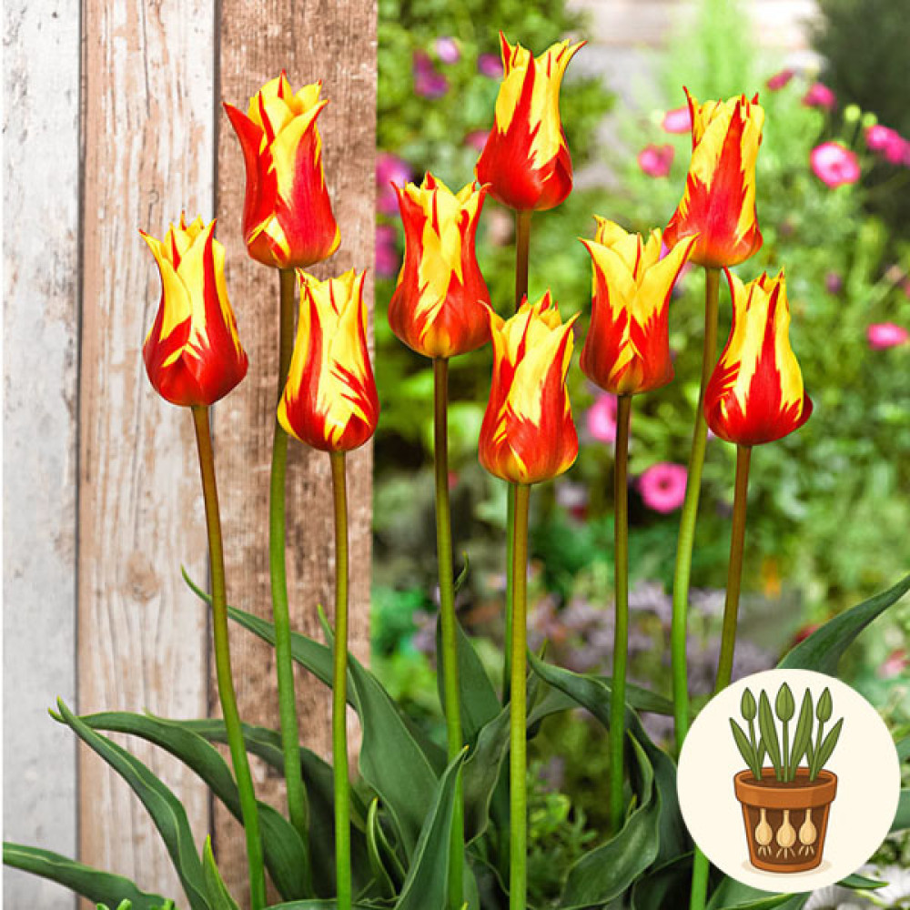 У горщику висаджено три цибулини тюльпана сорту Firework. Це яскравий двоколірний сорт із великими квітами насиченого червоного кольору з жовтими «вогняними» мазками по пелюстках, що нагадують святковий феєрверк. Виразне забарвлення робить тюльпани Firework справжнім центром уваги у будь-якій весняній композиції.