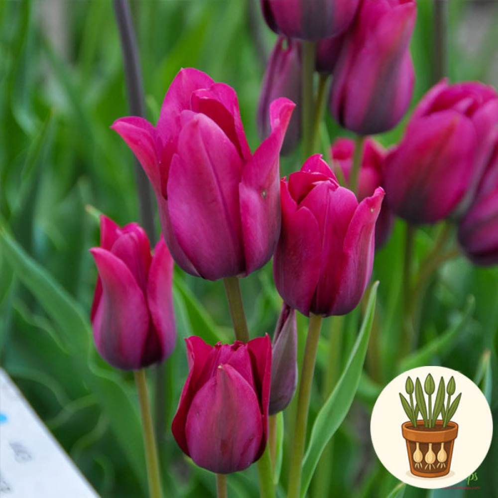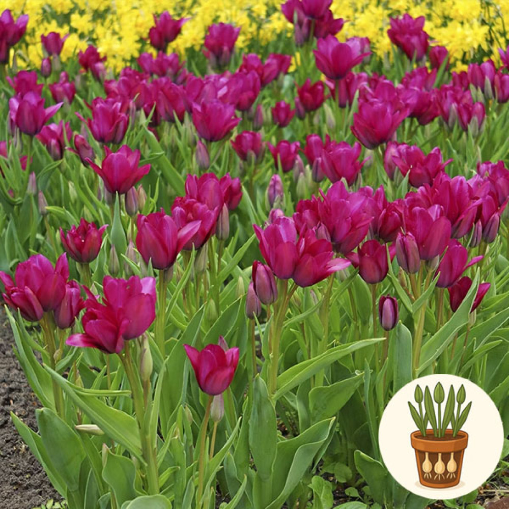 У горщику висаджено три цибулини тюльпана сорту Night Club. Це розкішний махровий сорт із великими, щільно наповненими бутонами насиченого винно-пурпурового відтінку з оксамитовим блиском. Глибокий темний колір і півонієподібна форма квіток роблять тюльпани Night Club справжнім акцентом у весняних композиціях у домі чи саду.