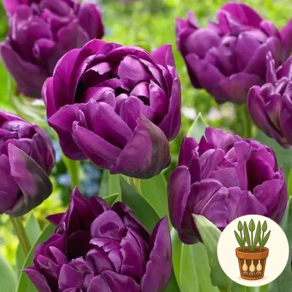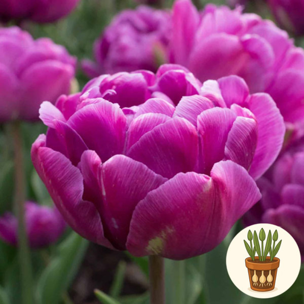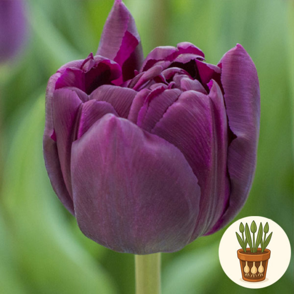 У горщику висаджено три цибулини тюльпана сорту Python. Це махровий ранній сорт із густонаповненими, півонієподібними бутонами насиченого пурпурового забарвлення. Округлі, багатошарові пелюстки створюють ефект розкішної «перлини» у горщику, тому тюльпани Python чудово підходять для оформлення підвіконь і весняних букетів.
