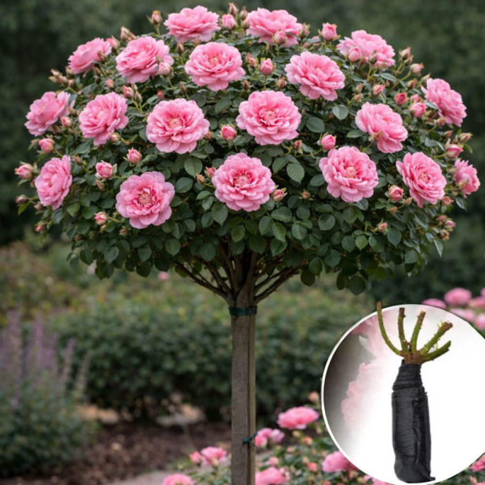 Троянда штамбова Ashley — штамбова форма сорту Ashley з великими дуже повними рожевими квітками старовинної розеткової форми. Квітки щільні, пелюсток багато, забарвлення чисто-рожеве з темнішим відтінком усередині. На штамбі сорт виглядає дуже парадно й акуратно.