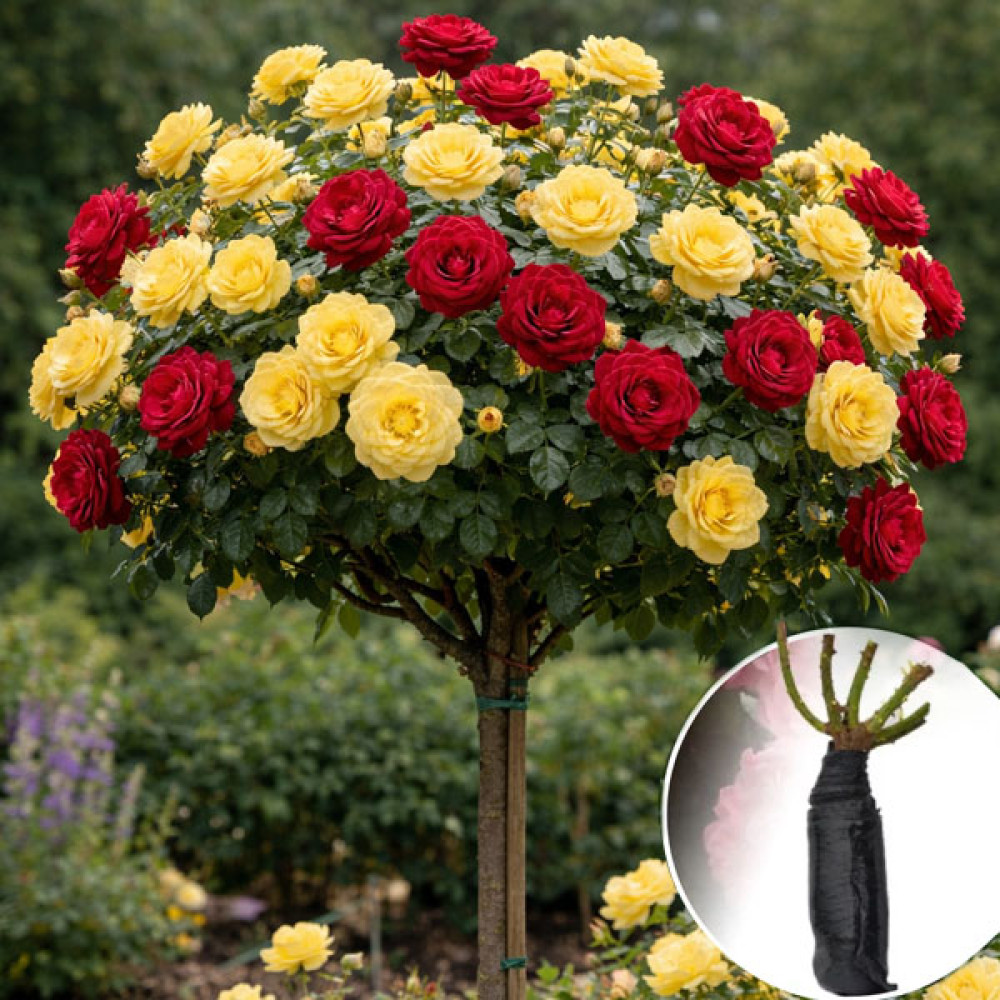 Штамбова троянда Anny Duperey/Tess — контрастна композиція на штамбі з лимонно-жовтої Anny Duperey і темно-червоної Tess. Anny Duperey дає дуже повні жовті квітки в невеликих китицях, а Tess — густомахрові темно-червоні квітки. На штамбі крона виходить яскравою, теплою та дуже виразною.