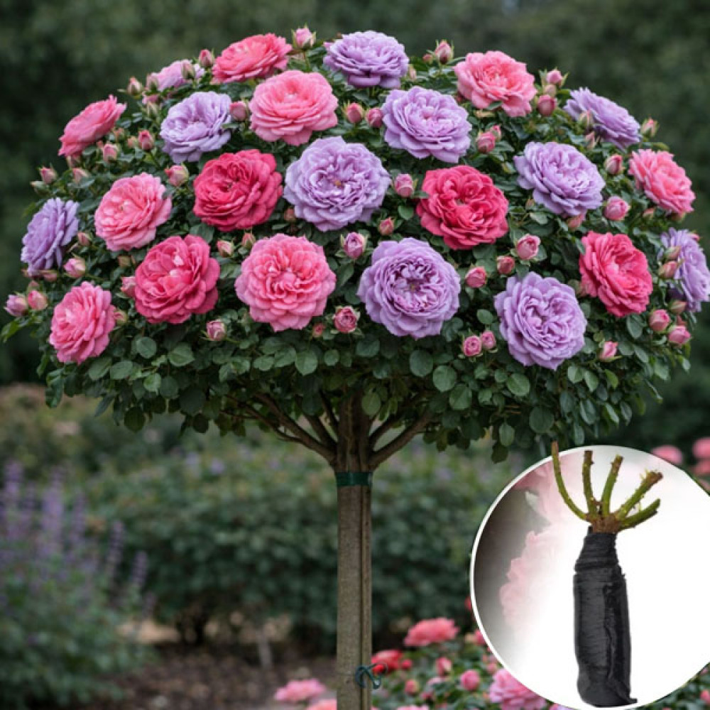 Штамбова троянда Ashley/Blue Sky Free — двокольорова композиція на штамбі з густомахрової рожевої Ashley та лілово-бузкової Blue Sky Free. Ashley формує великі дуже повні рожеві квітки старовинної розеткової форми, а Blue Sky Free дає лілово-бузкові квітки флорибунди. Поєднання виходить ніжним і контрастним одночасно.