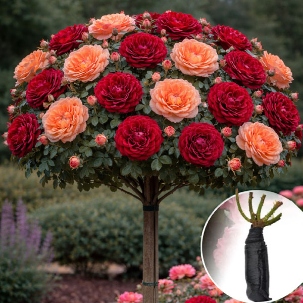 Штамбова троянда Emilien Guillot/Tess — контрастна композиція на штамбі з оранжево-червоної Emilien Guillot і темно-червоної Tess. Emilien Guillot формує великі повні квітки апельсиново-оранжевої або оранжево-червоної гами, а Tess дає густомахрові темно-червоні квітки.