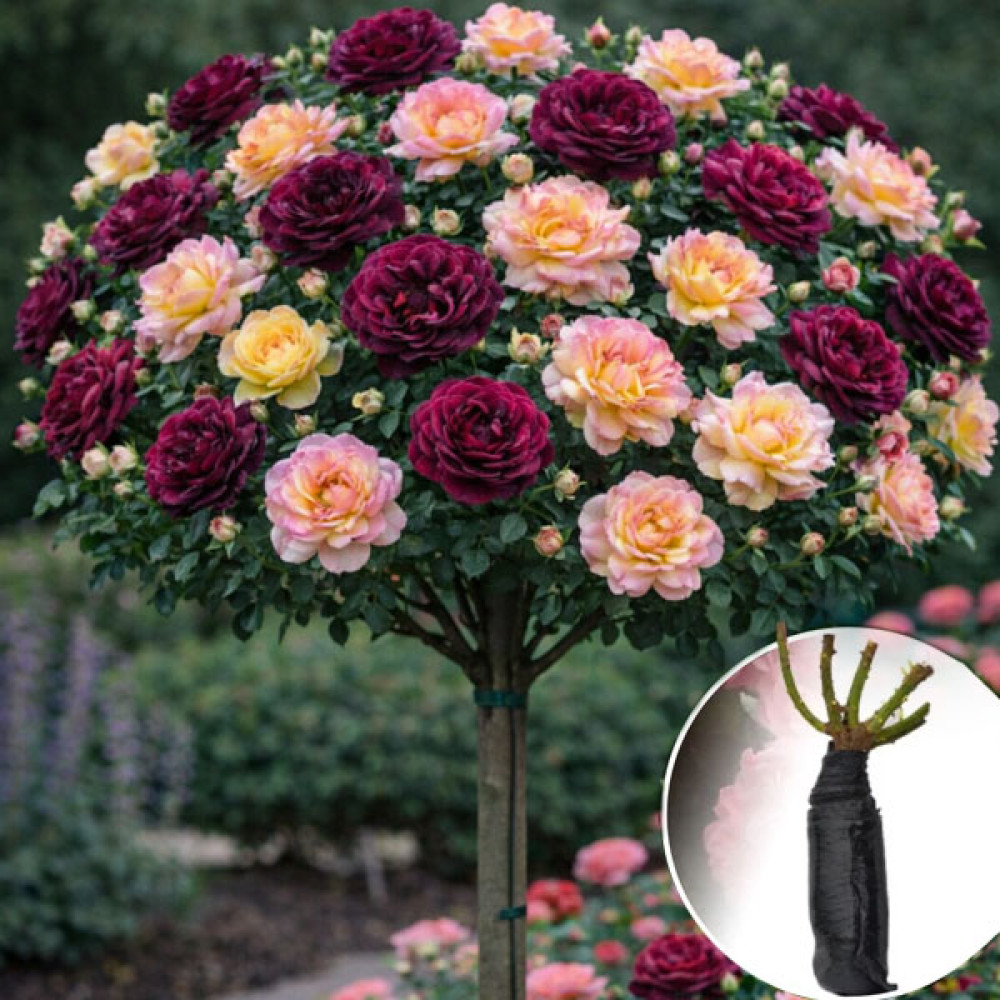 Штамбова троянда Munstead Wood/Gloria Dei — двокольорова композиція з темно-малиново-червоної Munstead Wood і великоквіткової жовто-рожевої Gloria Dei. Munstead Wood дає глибоко-червоні, майже винні розеткові квітки з сильним ароматом, а Gloria Dei — великі жовті квітки з рожевим краєм. Крона на штамбі виходить дуже контрастною та класично ефектною.