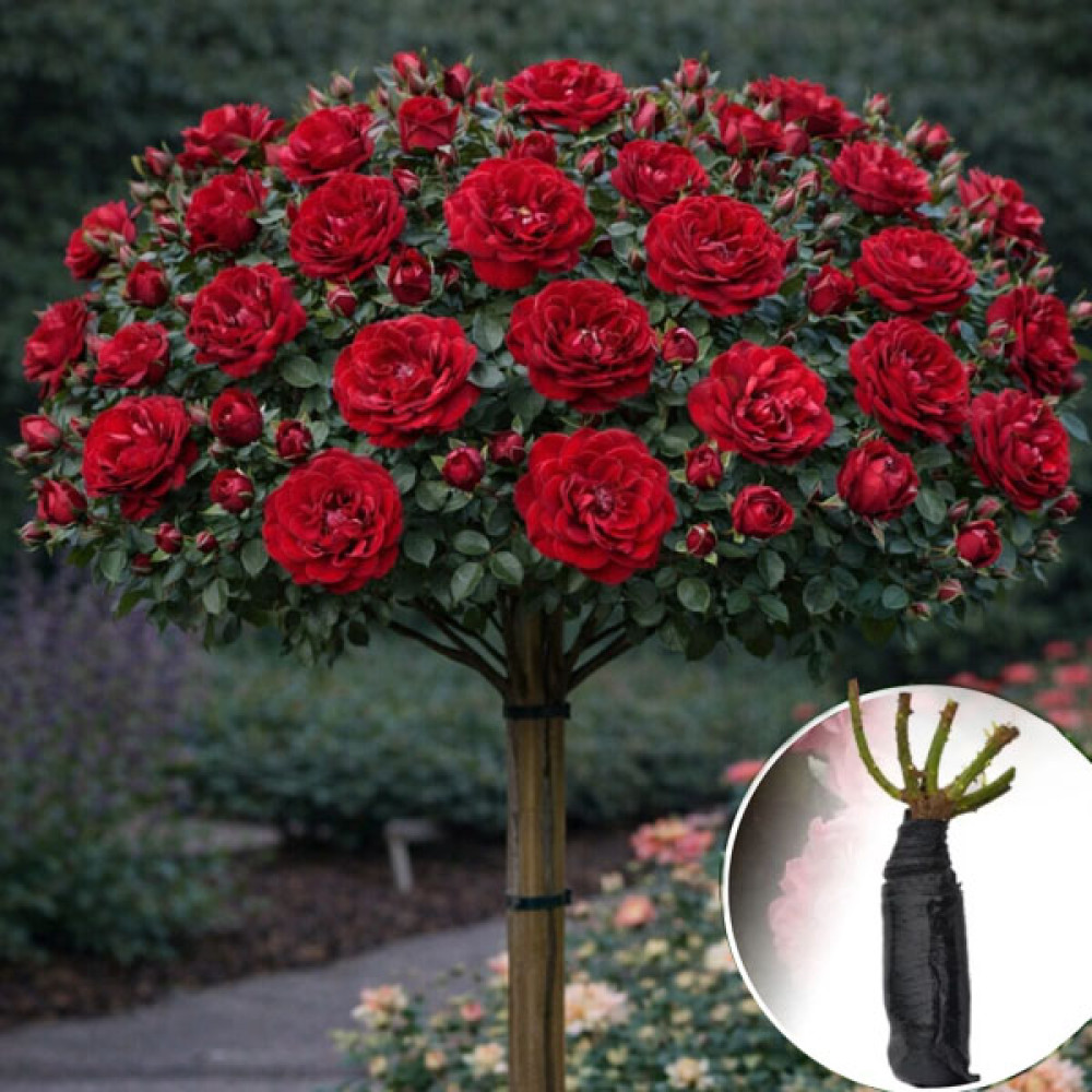 Троянда штамбова Tamango — штамбова форма старого надійного сорту Tamango з насичено-червоними квітками, що з віком можуть набувати пурпурового відтінку по краях. Сорт належить до флорибунда, добре гілкується й цвіте великими китицями, тому на штамбі утворює рясну квітучу крону.