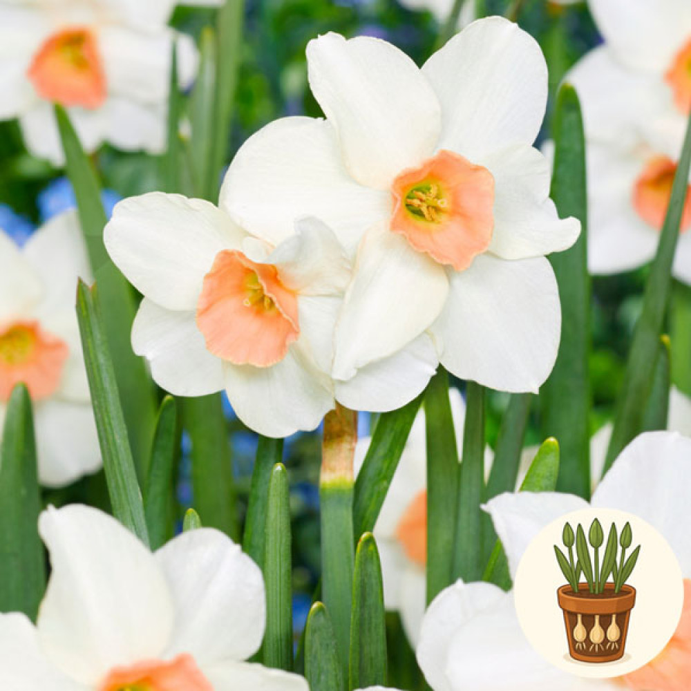 В горшок высажены три луковицы нарцисса сорта Doll Baby. Это изящный сорт с белыми лепестками и лососево-розовой открытой коронкой, которая выглядит как аккуратная миниатюрная чашечка в центре цветка. Нежная двухцветная палитра и приятный аромат делают нарцисс Doll Baby идеальным для романтических весенних композиций на подоконнике или террасе.