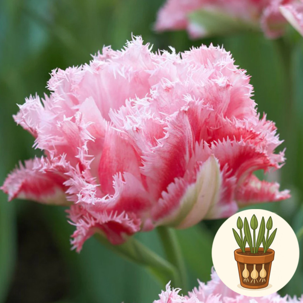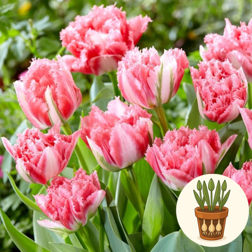 В горшок высажены три луковицы тюльпана сорта Crispion Sweet. Это изысканный бахромчатый сорт с крупными цветами нежно-розового цвета с белыми высветлениями и густой кружевной бахромой по краям лепестков. Утончённая фактура и деликатная окраска делают тюльпаны Crispion Sweet настоящим «десертом» в весенних композициях.