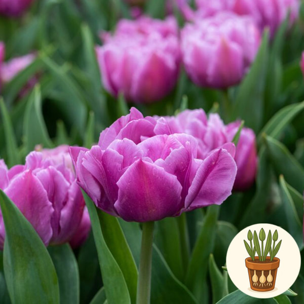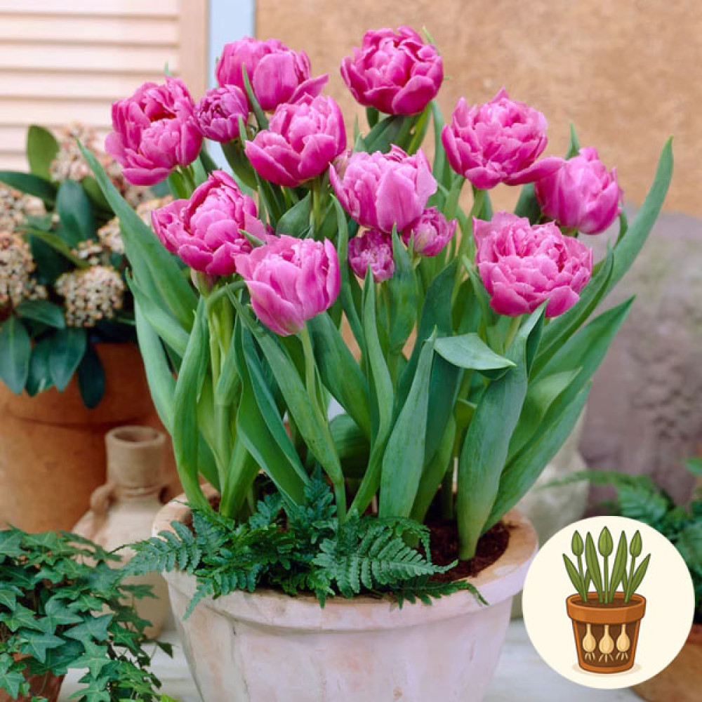 В горшок высажены три луковицы тюльпана сорта Double Price. Это махровый ранний тюльпан с крупными пионообразными цветками насыщенного розового цвета с более светлыми, почти белыми переливами у основания лепестков. Плотно наложенные лепестки образуют пышный, объёмный бутон, который отлично смотрится и в горшке, и в срезке, придавая композициям яркое, по-настоящему весеннее настроение.