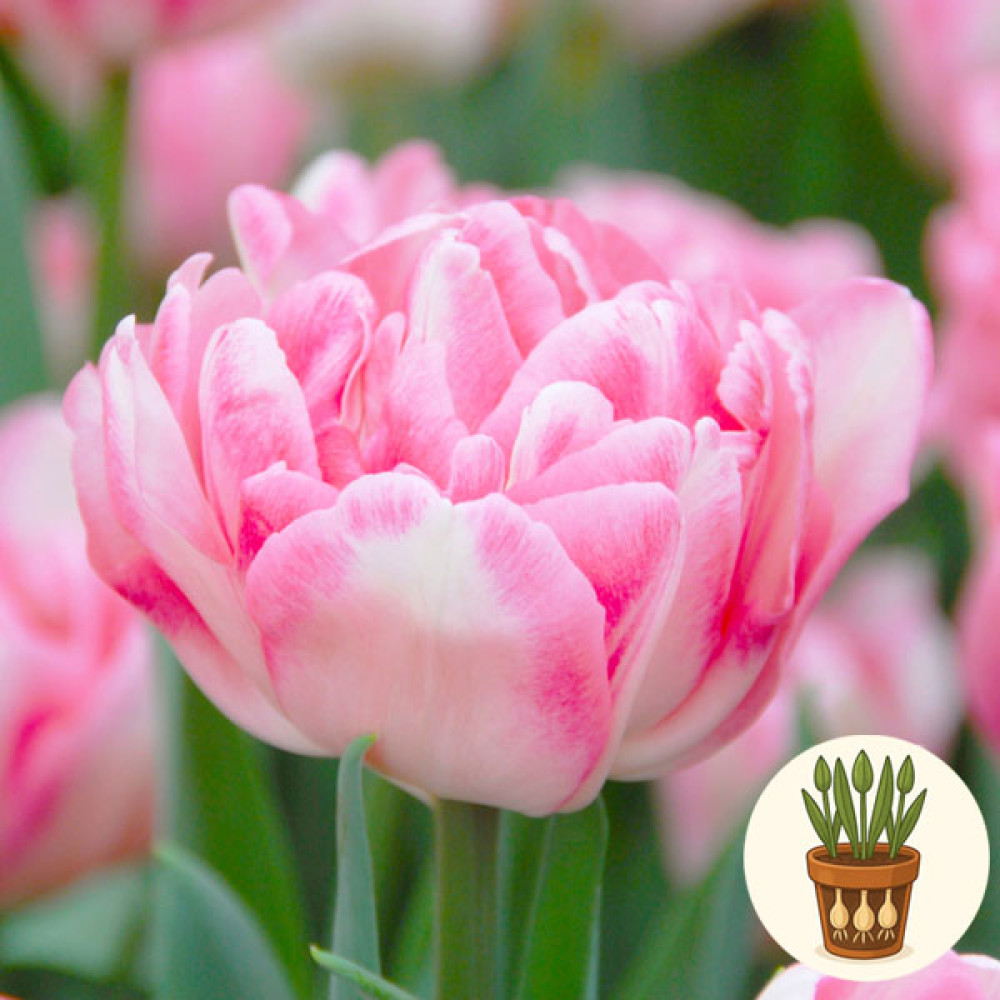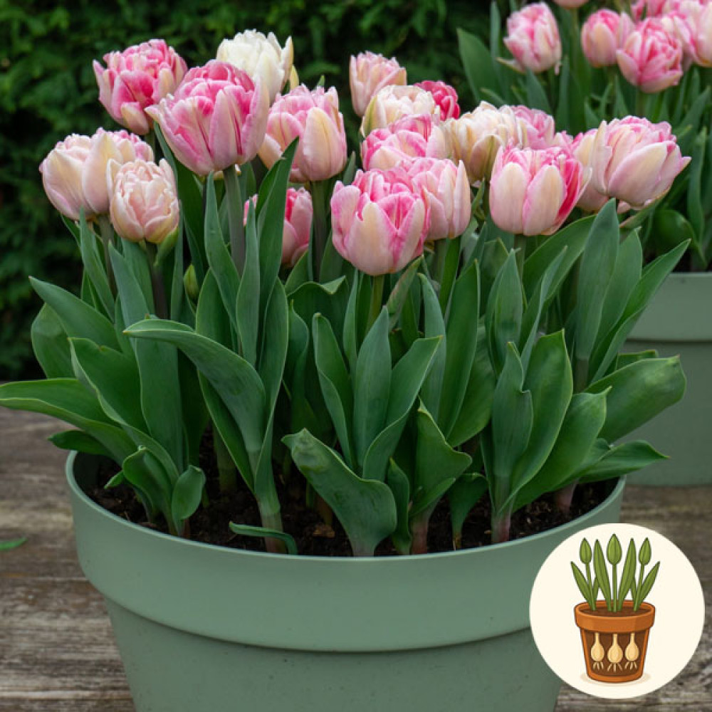 В горшок высажены три луковицы тюльпана сорта Foxtrot. Это популярный махровый ранний сорт с крупными пионообразными цветами нежно-розового цвета с белыми высветлениями. Пышные, округлые бутоны выглядят очень деликатно и романтично, идеально подходя для подоконников, столов и весенних букетов.