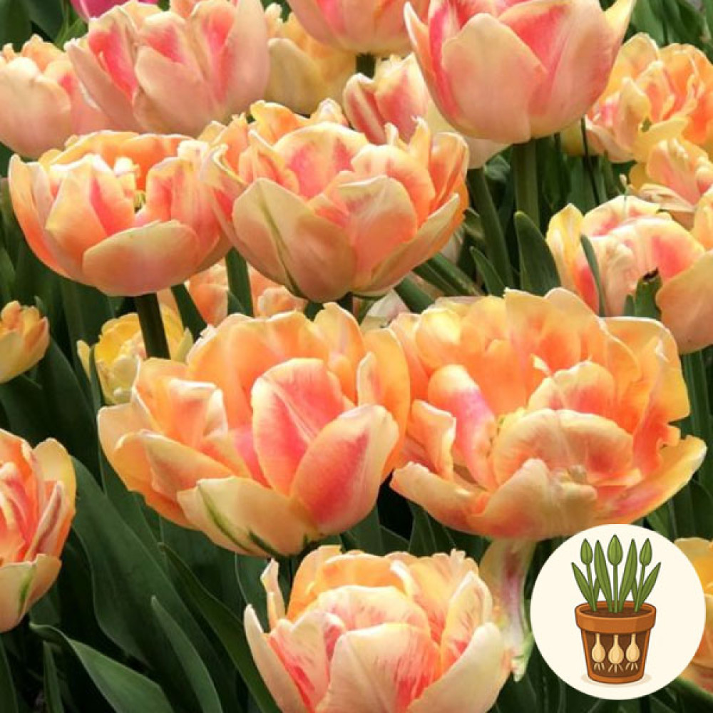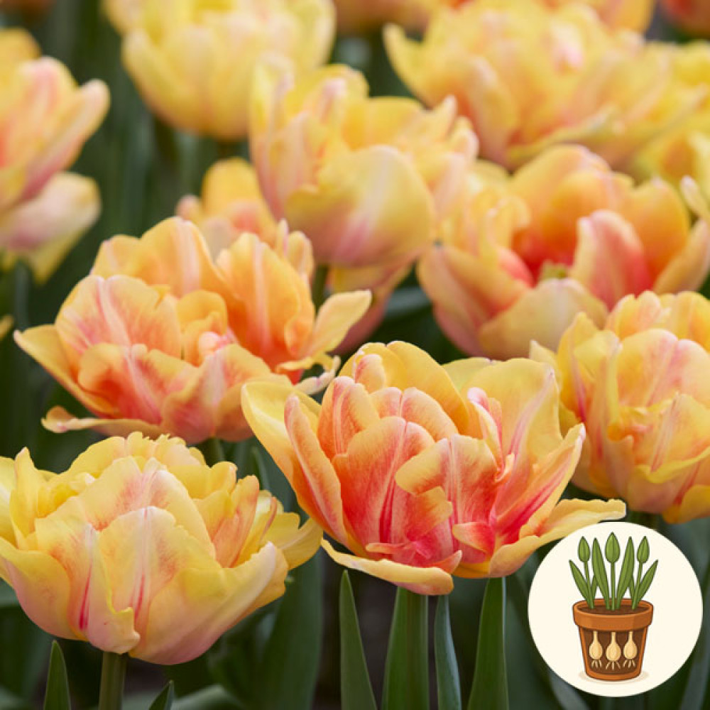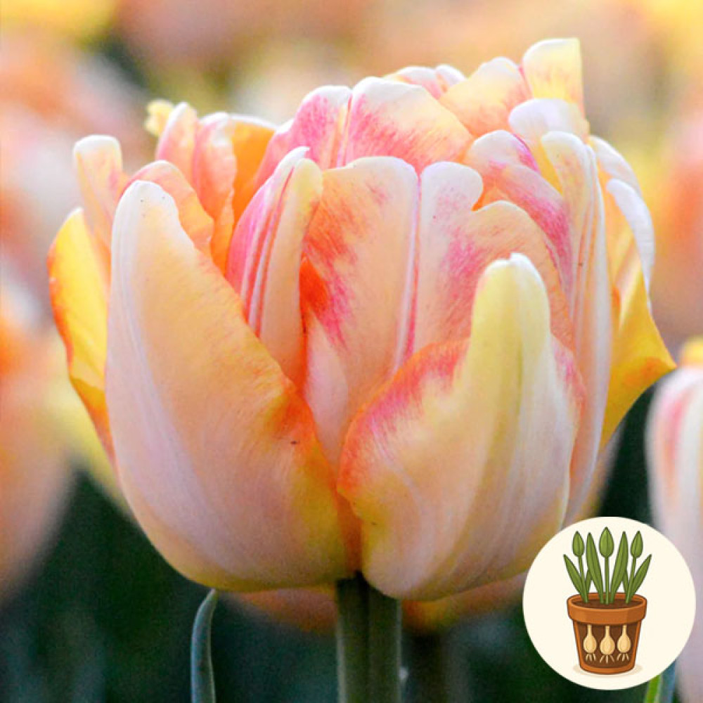 В горшок высажены три луковицы тюльпана сорта Foxy Foxtrot. Это один из самых эффектных махровых ранних сортов с объёмными, многослойными цветами в тёплых жёлто-абрикосовых, персиковых и розовых оттенках. Лепестки словно раскрашены акварелью, что делает каждый цветок уникальным.