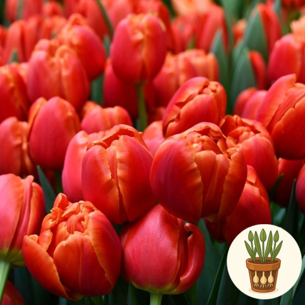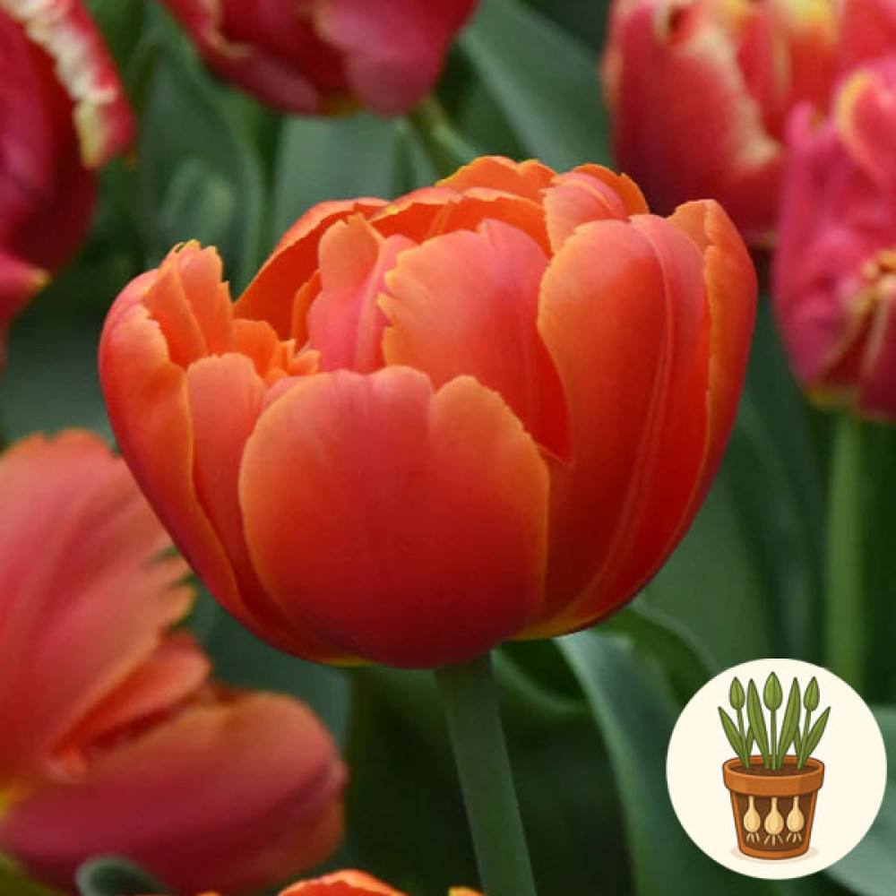 В горшок высажены три луковицы тюльпана сорта Icoon. Это яркий сорт с крупными бокаловидными цветами насыщенного оранжевого цвета с тёплыми красноватыми и медными переливами. Тюльпаны Icoon выглядят очень сочными и энергичными, добавляя ощущение праздника в любое пространство.