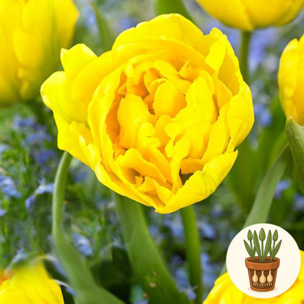 В горшок высажены три луковицы тюльпана сорта Limousine. Это яркий махровый ранний сорт с крупными, пионообразными цветами насыщенного солнечно-жёлтого цвета. Пышные, многослойные бутоны выглядят невероятно празднично и мгновенно «освещают» любое пространство — подоконник, террасу или весеннюю композицию в саду.