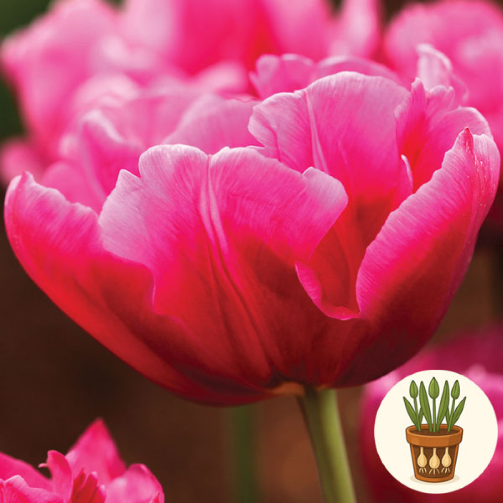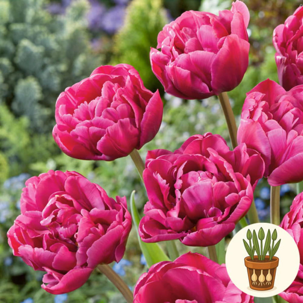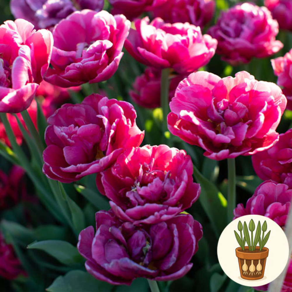 В горшок высажены три луковицы тюльпана сорта Margarita. Этот роскошный махровый сорт напоминает старинную розу: плотные лепестки образуют полный цветок лилово-розового оттенка с мягким свечением и лёгким высветлением к краям. Тюльпаны Margarita придадут композициям романтичный, по-настоящему праздничный вид в доме или саду.