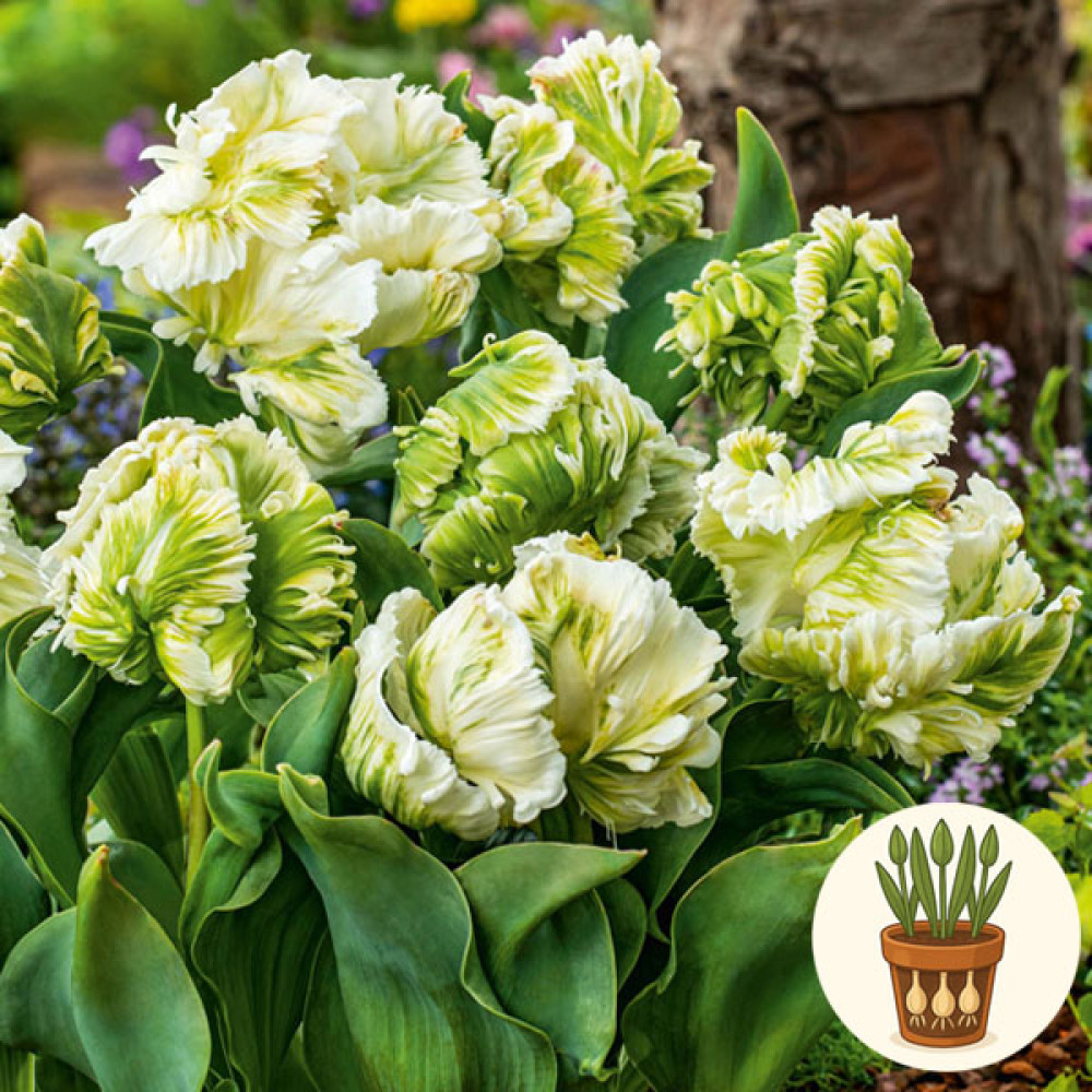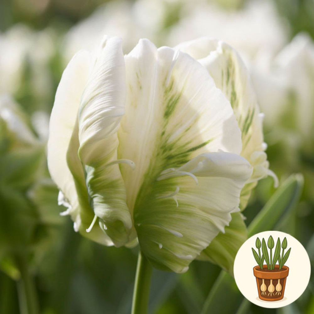 В горшок высажены три луковицы тюльпана сорта Super Parrot. Это впечатляющий попугайный сорт с крупными белыми цветами с яркими зелёными мазками и сильно волнистыми, «перистыми» лепестками. Необычный контраст цветов и фактур делает тюльпаны Super Parrot настоящей изюминкой среди весенних горшечных композиций и клумб.