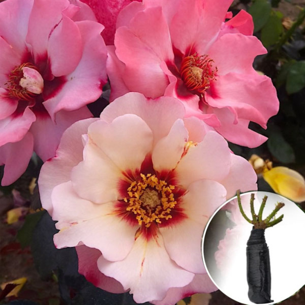 Роза Princess Of Phoenicia — эффектный сорт с необычной контрастной окраской: кремовые лепестки с рубиново-красным центром, которые с возрастом розовеют. Сорт формирует кустистый, раскидистый куст и цветёт очень долго.