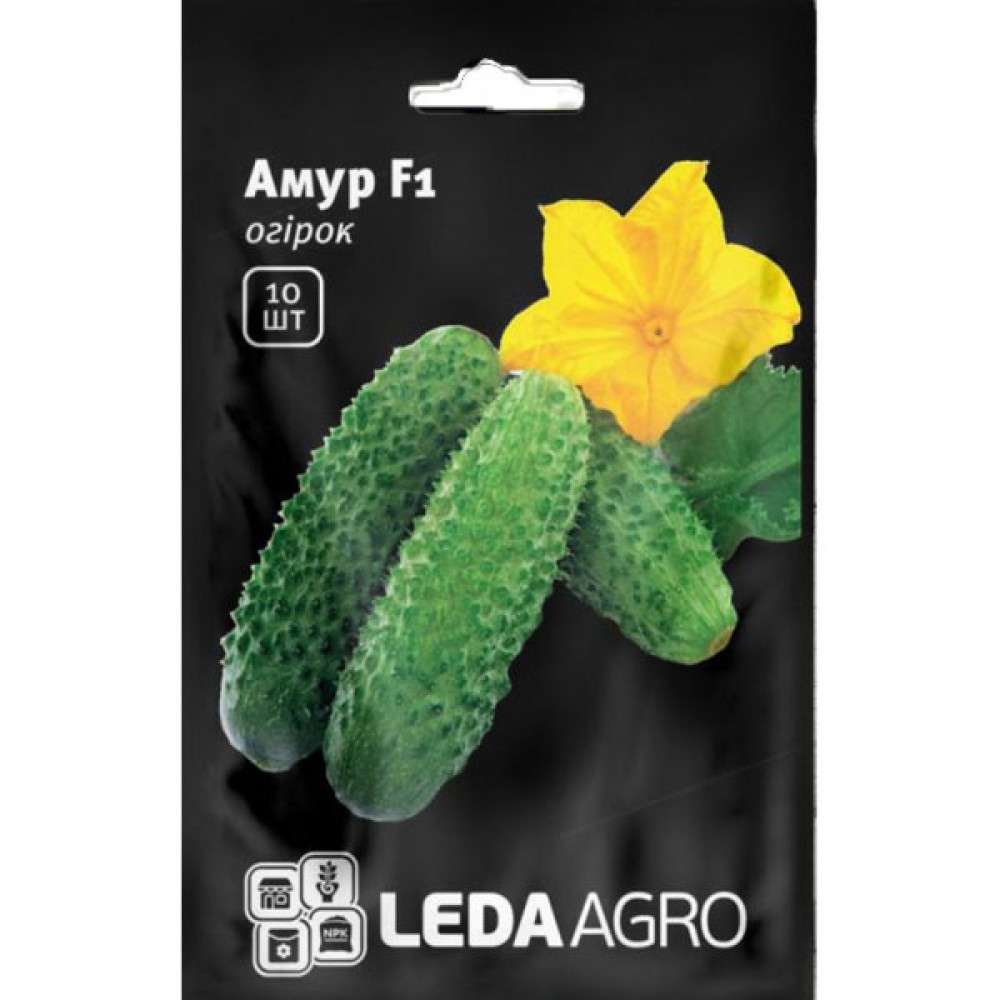 Огірок Амур F1 - надзвичайно ранній гібридний сорт. Висів насіння починають після такого, як зникне загроза заморозків і температура & ґрунту буде сягати не менше +10 градусів. Середня глибина посадки 3-4 сантиметри. Рослина розростається кущем висотою до 20 сантиметрів, що стелиться по землі. Для того щоб досягти високої врожайності ґрунт потрібно регулярно зволожувати та вносити мінеральні добрива. Сорт Амур F1 є досить популярним завдяки своїй стійкості до хвороб та вірусів. & Плоди зеленого кольору, подовгастої овальної форми. Поверхня горбиста з колючками. Не товста шкірка надає огірку неймовірної хрусткості та соковитого смаку. Чудово підходить для салатів та квашення.