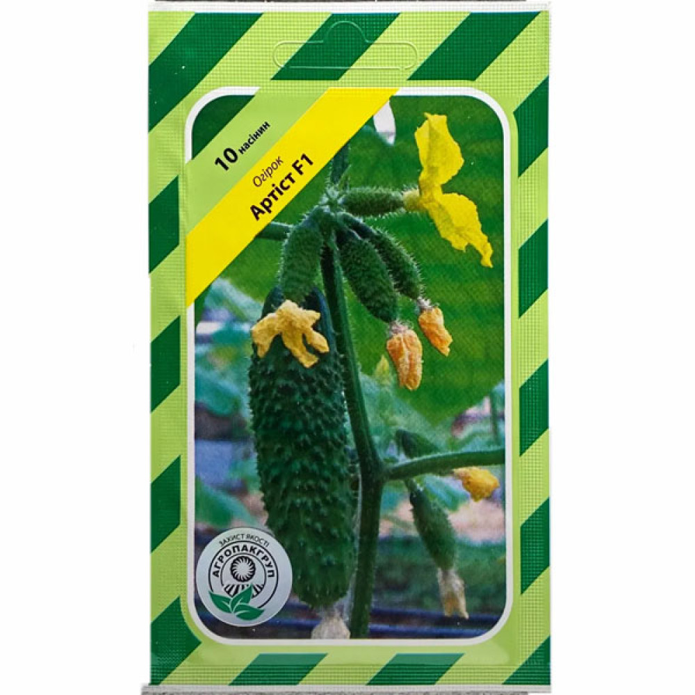 Огірок Артіст F1 - дуже ранній гібридний сорт. З хорошою врожайністю, як у відкритому ґрунті так і в тепличних приміщеннях. Дозрівання настає на 42 день після посіву. Рослина розвивається у формі куща висотою не більше 20 сантиметрів, з міцним стеблом та розширеною кореневою системою. В кожній листовій пазусі формується по 6 плодів. Розмір огірків невеликий, масою понад 80 грам. Поверхня плоду з шипами. Огірок Артіст F1 є витривалим до слабкого освітлення та технічних пошкоджень. Смак без гіркоти дозволяє сповна насолодитись плодами Артіст F1 у свіжому вигляді.